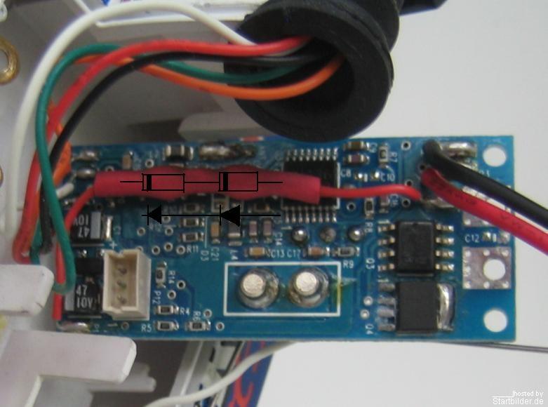 Kurz gesagt. In das Schalterkabel 2 Dioden einbauen, so dass man 2x0,7 Volt weniger Spannung an der Elektronik hat. Die Volle Spannung geht trotzdem an den Motor. Mehr davon in Richies Bootthread oder im 1:18 Mopedthread. _________________ Daniel wird beschleunigt von seiner ZZR1100
