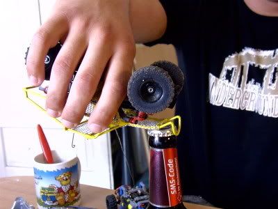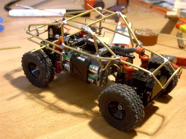 ich habe 2mm starkes messing rohr verwendet. Den Käfig habe ich mit einer Querstrebe aus messing an der hinteren Alu Dämpferbrücke versehen. dann die Bohrung der Dämpferbrücke auf M2 erweitert. Somit konnte ich den Käfig mit der hinteren Dämpferbrücke verschrauben. Ist "bullet"proof. mein 3 jähriger Sohn hat ihn schon inspiziert und mit gespielt. Er hat ihn für gut empfunden da er noch ganz ist! *GG*