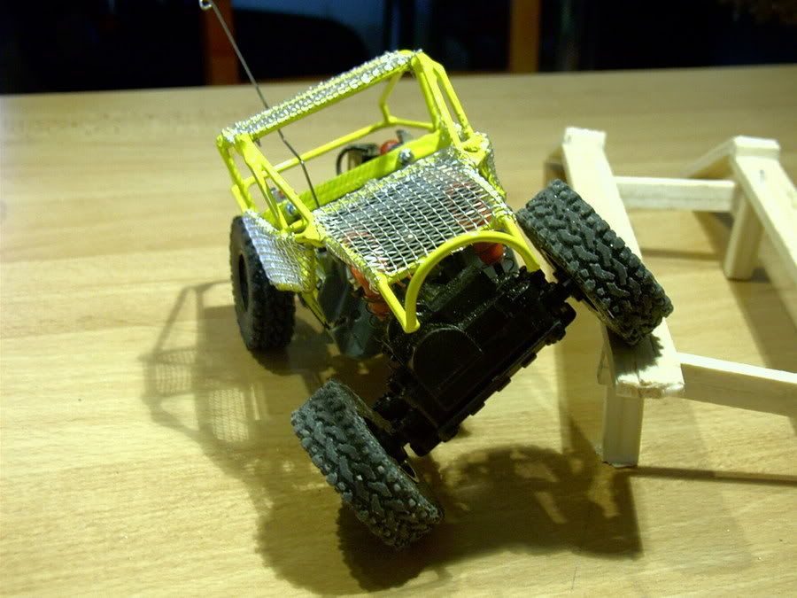 also zu meiner und des crawler entschuldigung muß ich gestehn das die anbringung vom käfig ans chassis vieleicht nicht due richtige lösung ist. aber zum akku wechsel wollt ich net immer den käfig abschrauben müssen. so kann ich die akkus von schräg unten einlegen ohne den käfig abschrauben zu müssen.